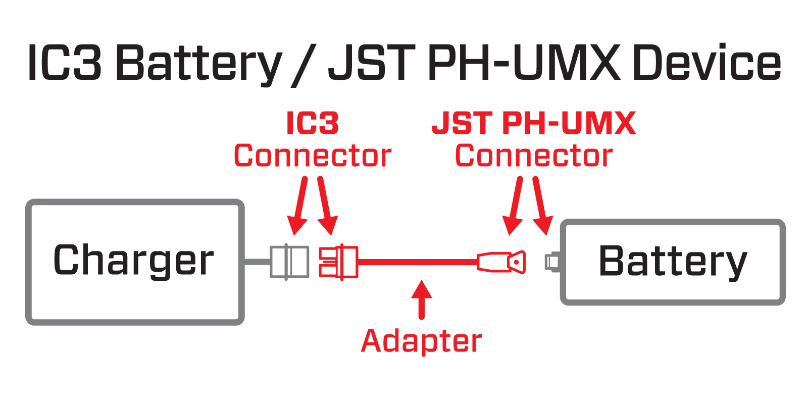 - This adapter adapts a battery with an JST PH-UMX connector to a device with a IC3 connector