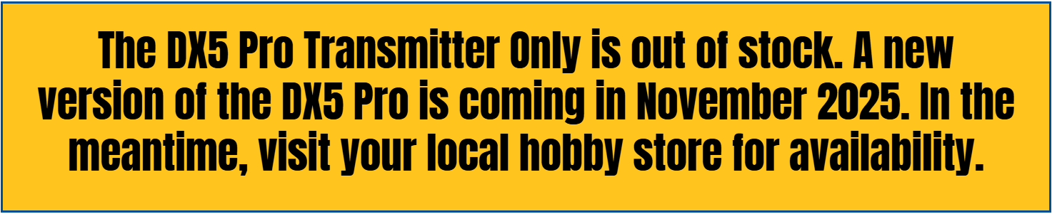 Available as transmitter only or matched with an SR2100 DSMR® receiver, the DX5 Pro delivers the performance and comfort of a pro-class radio at a price that won't break your hobby budget. Its improved ergonomics, connectivity and programmability are ready to take your control to the next level.