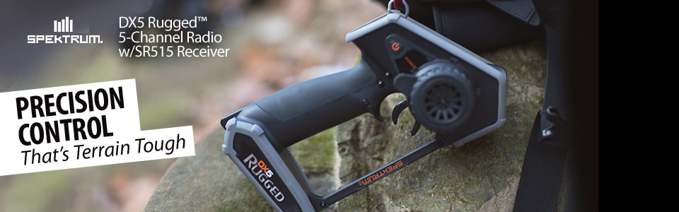 Your vehicles are extremely durable, why not your transmitter? The Spektrum™ DX5 Rugged™ 5-channel surface transmitter redefines radio control with a level of durability to match the tough conditions off-roaders, bashers and boaters encounter constantly. We started with a chassis based on the superb Spektrum ergonomic design found on the popular DX5C and competition favorite DX5 Pro. From there, we integrated cordless power tool feature ideas for the die-hard punishment those products endure. The result is a class-leading RC system with unmatched durability in addition to other innovative features that unite with a level of precision, versatility and convenience you won’t want to play without.