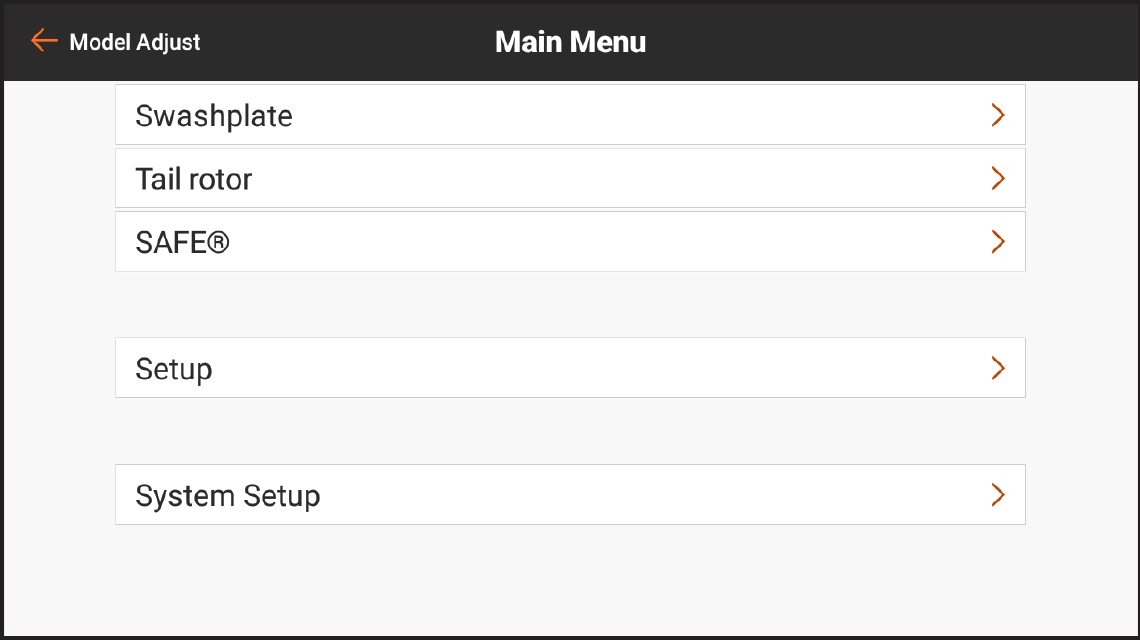 Forward Programming allows pilots to easily setup, program, and tune the FC6350HX with no need for extra hardware, devices, or computers. Pilots can quickly make tuning changes on the flight line to the swashplate, tail rotor, SAFE stability, flight modes and more, right from their compatible Spektrum transmitter. All this is available with all current DX, iX, and NX transmitter models (an update may be required).