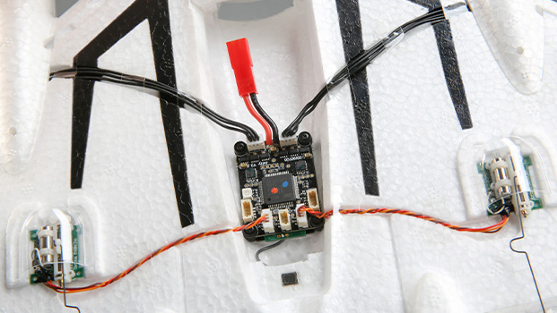 A trade-off with a PCB antenna is that the device itself is effectively the antenna, so the placement of the receiver is key. The distance the antenna is from particular objects in your airframe is one of, if not the most critical, aspect to keep in mind. As with whip-style antennas, the antenna tip must be at least three inches (roughly eight centimeters) away from other antennas, batteries, fuel tanks, engines, and electronic devices such as ESCs, motors, servos, etc.